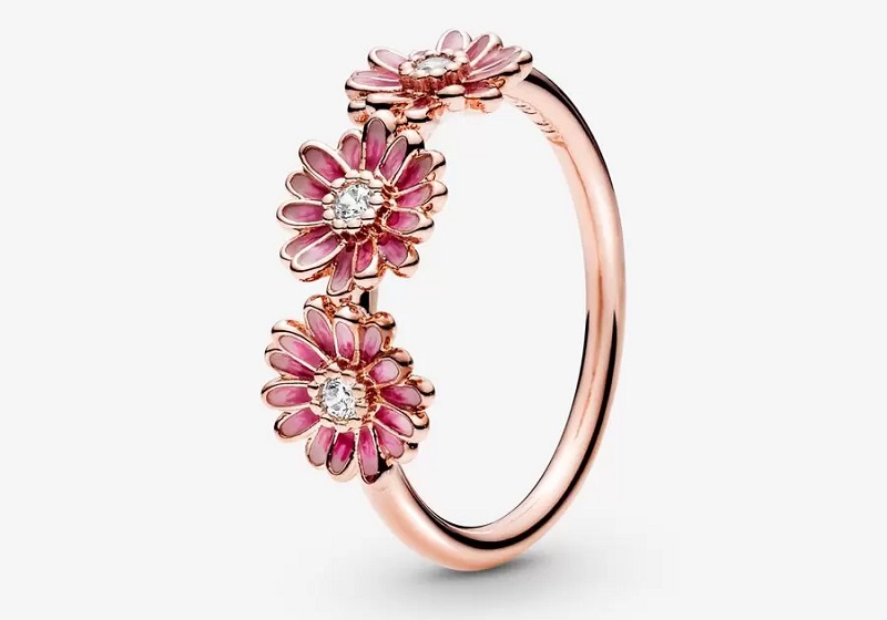 Otra propuesta con toque primaveral es este anillo Trío de Margaritas Rosas. El diseño se inspira en una corona de flores. La pieza tiene un recubrimiento de oro rosa de 14 quilates y está decorada con tres flores esmaltadas, embellecidas con una circonita cúbica en el centro. Los pétalos están pintados a mano. Pandora lo ha puesto a la venta por 89 euros.