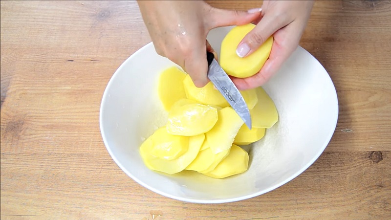 Corta las patatas en rodajas y ponlas en otro bol. Intenta que queden finas, en torno a medio centímetro de grosor, para que no te queden crudas al hornearlas. Hay que hacer lo mismo que con las verduras, es decir, salpimentarlas. Échales un poco de pimienta negra molida junto a un puñadito de sal. Mézclalo todo para que se reparta bien.
