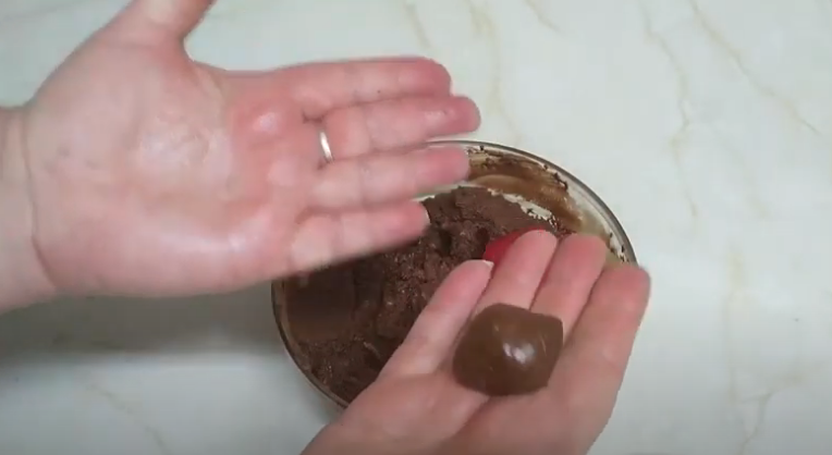 Toma una pequeña porción de la mezcla con la ayuda de una cuchara y ponla sobre tu mano. Forma una bola y observa como quedan tus manos. Si las mismas quedan sin mancha alguna de chocolate, es porque la crema está en su punto perfecto para ser trabajada.
