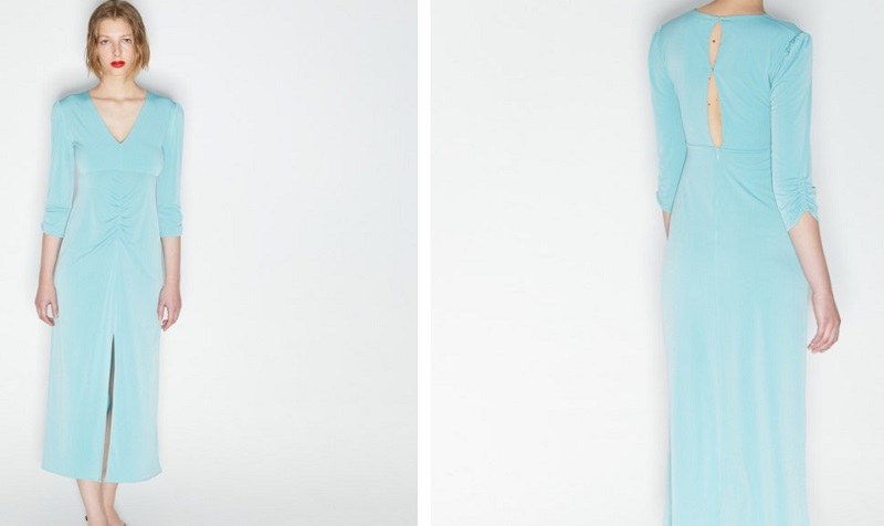 Otra opción para una ocasión especial es un vestido midi con cuello en forma de pico. Está disponible en color azul aguamarina o en fucsia. Los frunces recorren toda la prenda y le aportan algo de volumen. Presenta una abertura delantera para que sea más sencillo andar y otra trasera que deja parte de la espalda al aire. Sfera lo tiene a la venta por 25'99 euros.