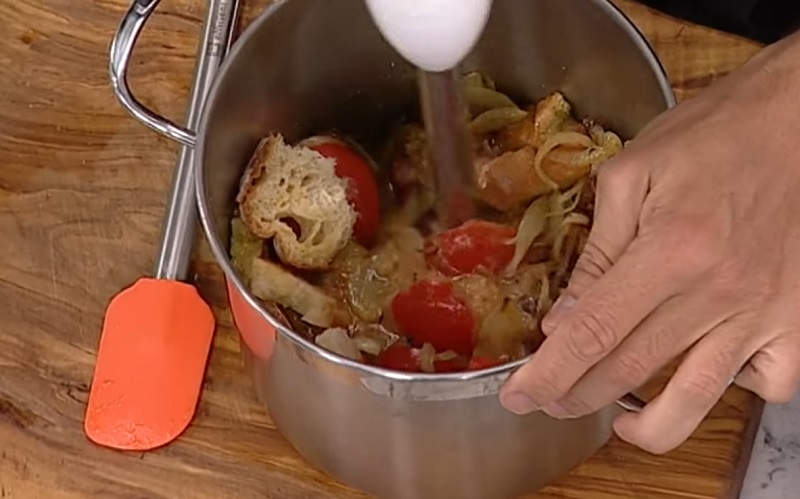 Antes de ponerte manos a la obra a triturar el gazpacho, tienes que echarle una pizca de sal y pimienta al conjunto. Una vez que la hayas añadido, ya puedes coger la batidora para infusionar toda la mezcla. Si te queda muy espeso, puedes ponerle un vaso de agua. Así conseguirás una textura más líquida, pero depende de cómo te guste que te quede a ti este plato: para beber o para tomarlo con cuchara.