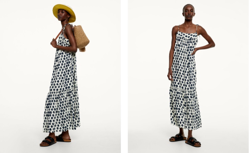 En último lugar, te mostramos un maxi vestido estampado de lunares negros sobre un fondo blanco. El modelito cuenta con un escote recto y tirantes ajustables. Además, presenta volantes en el bajo que le aportan volumen. Esta prenda es de talla única, por lo que es recomendable que te lo prubes. Puedes comprarlo en Parfois por 29'99 euros.
