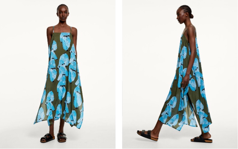 Un vestido ideal para el verano es este maxi estampado con algo parecido a unos plátanos azules sonbre un fondo verde oscuro. La prenda cuenta con un escote recto y tirantes finos ajustables. El modelito es de talla única, por lo que es recomendable que te lo pruebes para ver cómo le sienta a tu cuerpo. Puedes comprarlo en las tiendas de Parfois por 29'99 euros.