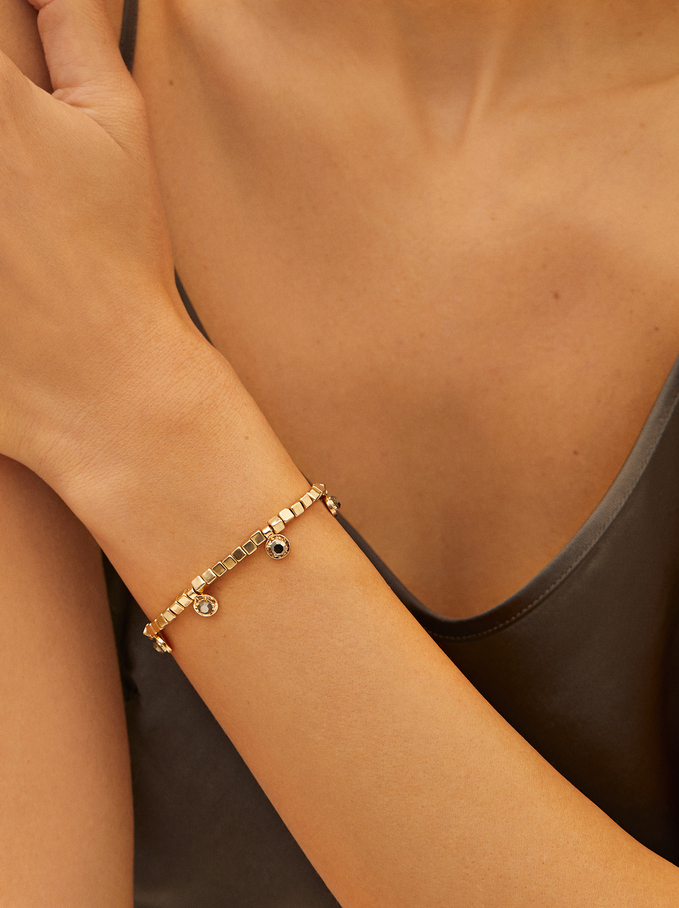 Entre los accesorios seleccionados destaca esta pulsera elástica, sencilla a la par que estilosa, con cristales y abalorios. Como puedes observar en la foto, te darán un toque chic y nadie sabrá cuánto te ha costado.