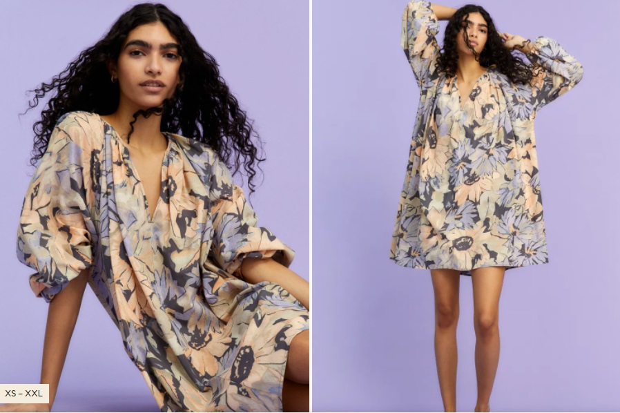 Si te ha gustado el primer estampado, puedes hacerte con otra prenda que lo tiene. En este caso, nos encontramos ante un vestido evasé corto hecho de algodón vaporoso. Se trata de un modelo oversize, es decir, que se lleva suelto como si fuera una talla mayor. Presenta el cuello redondo y una abertura de pico en el escote. Además, presenta mangas raglán con forma de globo largas que le aportan maxivolumen. H&M lo ha puesto a la venta por 19’99 euros.