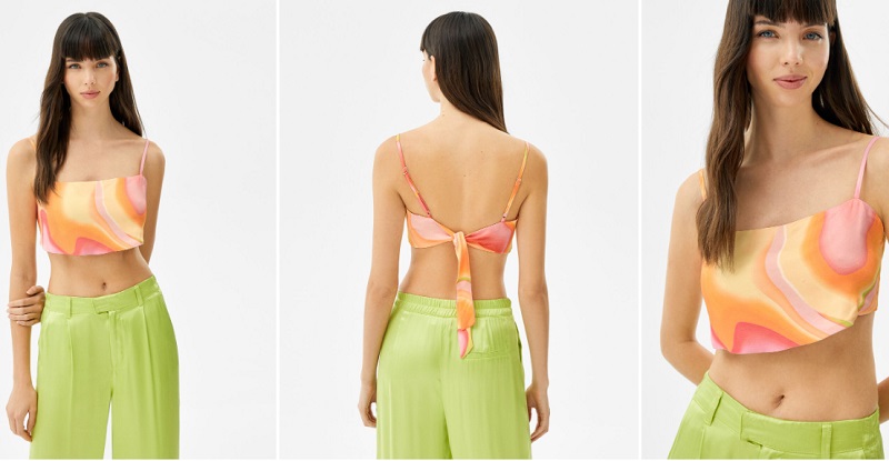 En último lugar, te mostramos un atractivo top de tirantes satinado, que está fabricado de viscosa. Del enganche de la espalda cae una lazada para que lo ates a tu medida. Está disponible con un estampado multicolor, en color crudo y en rosa. Bershka lo tenía a la venta por 15'99 euros, pero ahora lo puedes conseguir por apenas 11'19 euros.