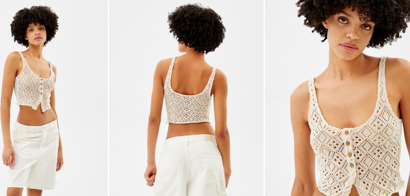 La siguiente prenda rebajada de esta marca es un atractivo top de tirantes de estilo crochet. Cuenta con un cierre abotonado en la zona frontal. Es semitransparentes, por lo que va a dejar parte de tu piel a la vista. Está disponible en color crudo, blanco roto y negro. Bershka lo tenía a la venta por 12'99 euros, pero ahora puedes conseguirlo por tan solo 9'09 euros.