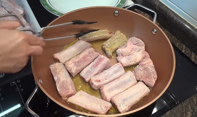 El siguiente paso de las costillas guisadas es poner las piezas de carne en la sartén cuando el aceite esté caliente. No pongas el fuego a máxima potencia para evitar que se quemen. En cuanto notes que se han dorado, dales la vuelta para que se hagan por el otro lado. Si no te entran todas a la vez, hazlo en diferentes tandas. Retíralas una vez que el rebozado adquiera un color tirando a dorado.