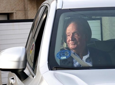 Procedente de una vivienda de su amigo Pedro Campos, en la que se aloja este fin de semana, el emérito ha bajado del vehículo vestido con ropa deportiva y apoyado en un bastón. Le acompaña un asistente y el alcalde de la localidad pontevedresa, Telmo Martín.
