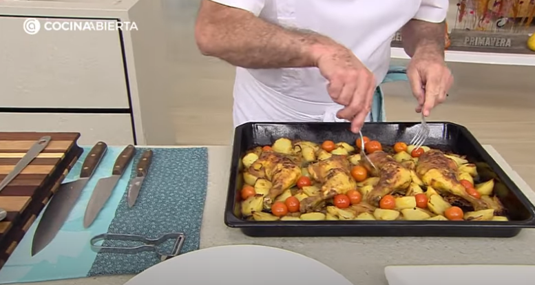 Para finalizar, transcurridos los 45 minutos finales, abre el horno y reparte sobre el pollo los tomates cherry y hornea por unos 6 minutos para que estos queden en su punto perfecto. Al finalizar la cocción, sirve el plato al estilo de Arguiñano, adornado con unas frescas hojas de perejil.