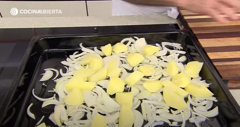 Una vez que tengas listas las cebollas y patatas, es momento de organizarlas para que queden perfectas en la bandeja.