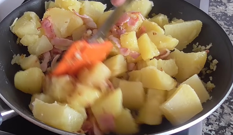 Cuando agreges las patatas a la sartén, mezcla todo el conjunto para que se empapen del sabor de la cebolla y el bacon. Tras unos minutos rehogándose, incorpórale tres champiñones cortados en láminas, aunque este ingrediente es opcional. Vuelve a mezclarlo todo y deja que se cocine durante cinco minutos. De esta manera, los hongos habrán reducido su tamaño.