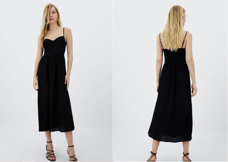 Muy parecido a la propuesta anterior, es este vestido negro. También es de tirantes y cuenta con un escote en forma de corazón. Y no solo eso, ya que presenta aros en el pecho que lo van a resaltar. Es de estilo corset, por lo que va a destacar tu cintura. Puedes comprarlo en las tiendas de Stradivarius, su página web o en la app por 25'99 euros.
