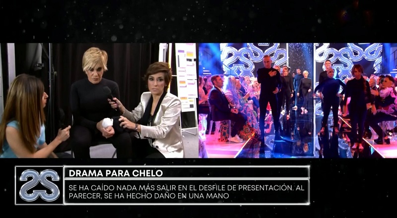 En los primeros compases de la noche, Chelo García Cortés sufrió una aparatosa caída. Los colaboradores de Sálvame estaban enfundados en un mono de neopreno para hacer de bailarines en la actuación de WRS, que ha sido la sintonía de la Fashion Week. La periodista se resbaló y se cayó apoyándose con la muñeca. Al salir, fue trasladada al hospital, donde le hicieron una radiografía que mostró que se había roto el radio.