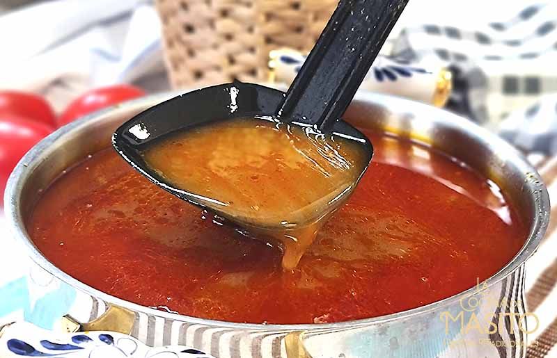 Una vez que estén pochados los ingredientes que has puesto en la cazuela, añádele un tomate en trozos. Cuando esté deshecho, échale agua y deja que se cueza todo durante media hora. Cuélalo y resérvalo. Chicote recomiendo que lo mantengas caliente si lo vas a usar pronto. En cambio, si vas a hacer la paella al día siguiente, guárdalo en la nevera.