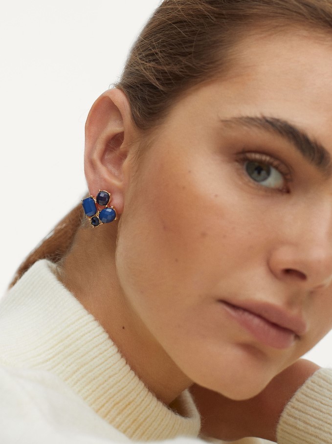Con una combinación de cuadro piedras unidas por una estructura dorada, estos pendientes son ideales para ti. Mezclan el negro con el azul y cuentan con una elegancia impactante.