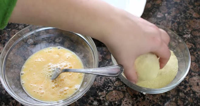 Pon en un plato hondo los huevos y bátelos muy bien con la ayuda de un tenedor. En otro plato coloca una buena cantidad de harina de trigo y en el otro el pan rallado o panko. Pasa cada una de las bombas por harina, luego por huevo y finaliza por pan rallado.