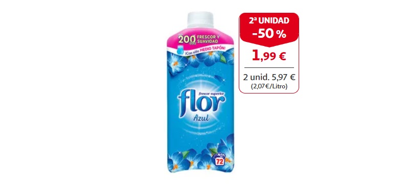 El suavizante es una de esas cosas que siempre hay que tener por casa por si se gasta. Por lo que no te va importar comprarlo de dos en dos, mucho más si vas a ahorrarte unos eurillos con este gesto. Si adquieres solo uno, te costará 3'98 euros. Mientras que si te llevas un par de botellas, la segunda te valdrá tan solo 1'99 euros. Además, no hay que olvidar que es una marca tan potente como Flor.