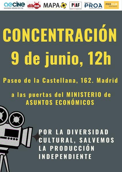 Las asociaciones y federaciones de productores independientes de cine y audiovisual, bajo el lema 'Por la diversidad cultural, salvemos la producción independiente', han convocado un acto este jueves 9 de junio ante el Ministerio de Asuntos Económicos para protestar contra la Ley Audiovisual.