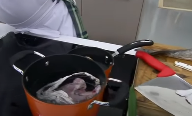 Con la merluza ya limpia y picada, puedes dar inicio a la preparación del plato. Pon dentro de una olla la cola, ijadas y cabeza de la merluza y cúbrelas con agua.