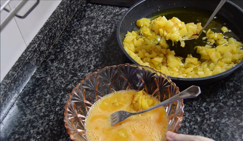 El siguiente paso de la tortilla de patatas es ir sacando los ingredientes poco a poco para bañarlos en el huevo batido. Hazlo con una espumadera y procura escurrir el aceite para que no quede muy grasiento. Vete haciéndolo hasta que termines con lo que esté en la sartén. Después, remuévelo todo para que se impregne del huevo y deja que repose durante unos minutos.