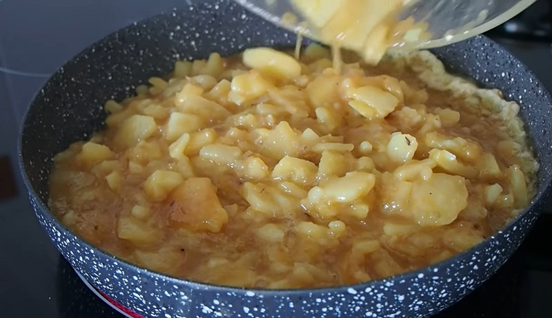 El siguiente paso es verter toda la mezcla de patata, huevo y cebolla sobre la sartén. Tiene que cocinarse a fuego medio fuerte sobre tres o cuatro minutos por cada lado. Esto depende de la textura que quieras que consiga: si te gusta cremosa dale la vuelta antes y si la prefieres tirando a cuajada déjala un poco más. Este proceso es muy sencillo...