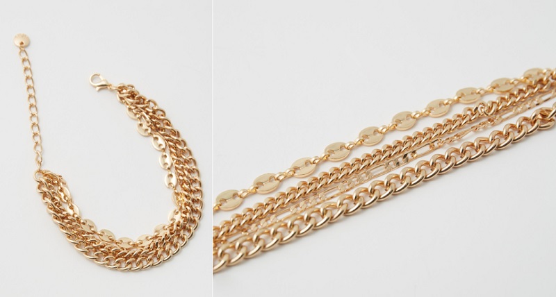 Otra opción del catálogo de bisutería de esta marca es una pulsera dorada. Esta joya está formada por multitud de cadenas de diferentes tamaños que van a abrazar a tu muñeca. Se cierra mediante un mosquetón, que le aporta mucha seguridad a la pieza para que no se abra. Lo mejor es su precio y es que Sfera lo tiene a la venta por solo 4'99 euros.