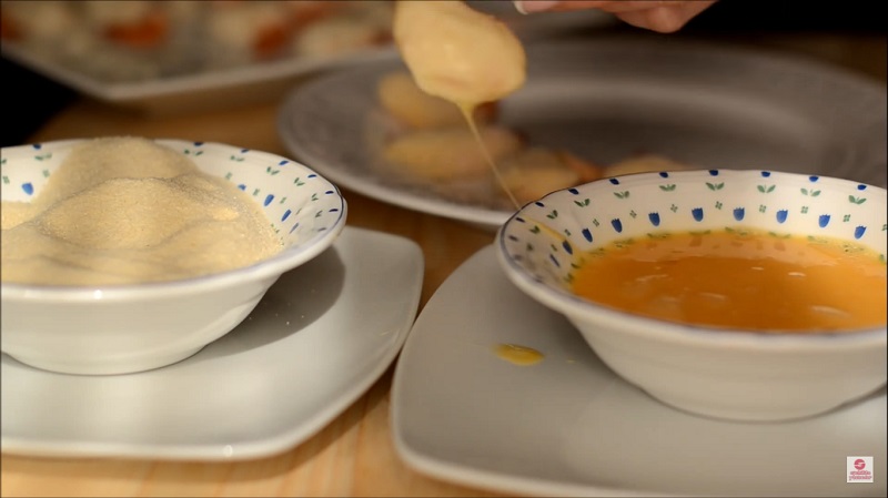 Lo siguiente es pasar a los langostinos con bechamel por huevo batido y pan rallado. Con que sumerjas una vez al marisco en cada recipiente es más que suficiente, aunque hay personas que le dan dos capas para que no se deshaga. Justo tras rebozarlo, lo tienes que meter en la sartén para freírlo. No lo pongas en un plato, ya que probablemente se te caiga algo del exterior.