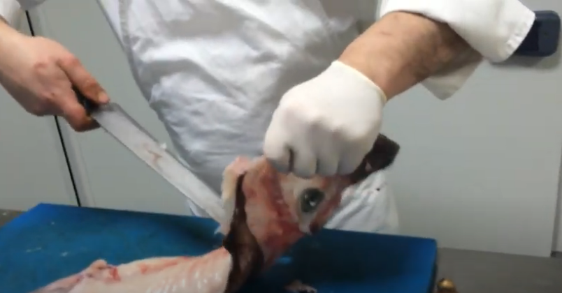En este espacio el trabajo será muy sencillo, pues estará más frágil y no tendrás que ejercer demasiada fuerza. Simplemente, coloca el cuchillo, presiona un poco y saldrá por completo. Así de fácil será despegar la cabeza del cuerpo del rape. La cabeza la puedes aprovechar también para el más delicioso caldo con sabor a mar.