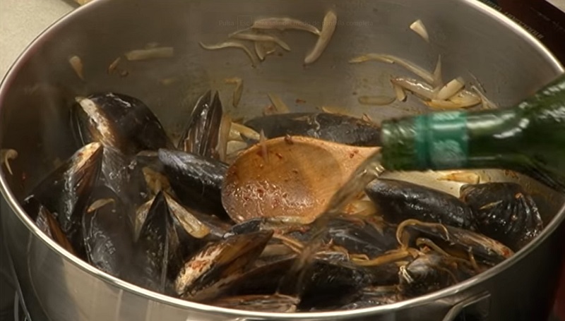 Vierte sobre los mejillones un chorro de vermú. De esta forma, se va a evaporar el alcohol y su sabor se quedará impregnado a los moluscos. Si no tienes ninguno por casa, puedes utilizar vino. Remuévelos con cuidado de que no se rompan y ponle la tapa a la cazuela para que el vapor se concentre en su interior. Continuamos con la receta...
