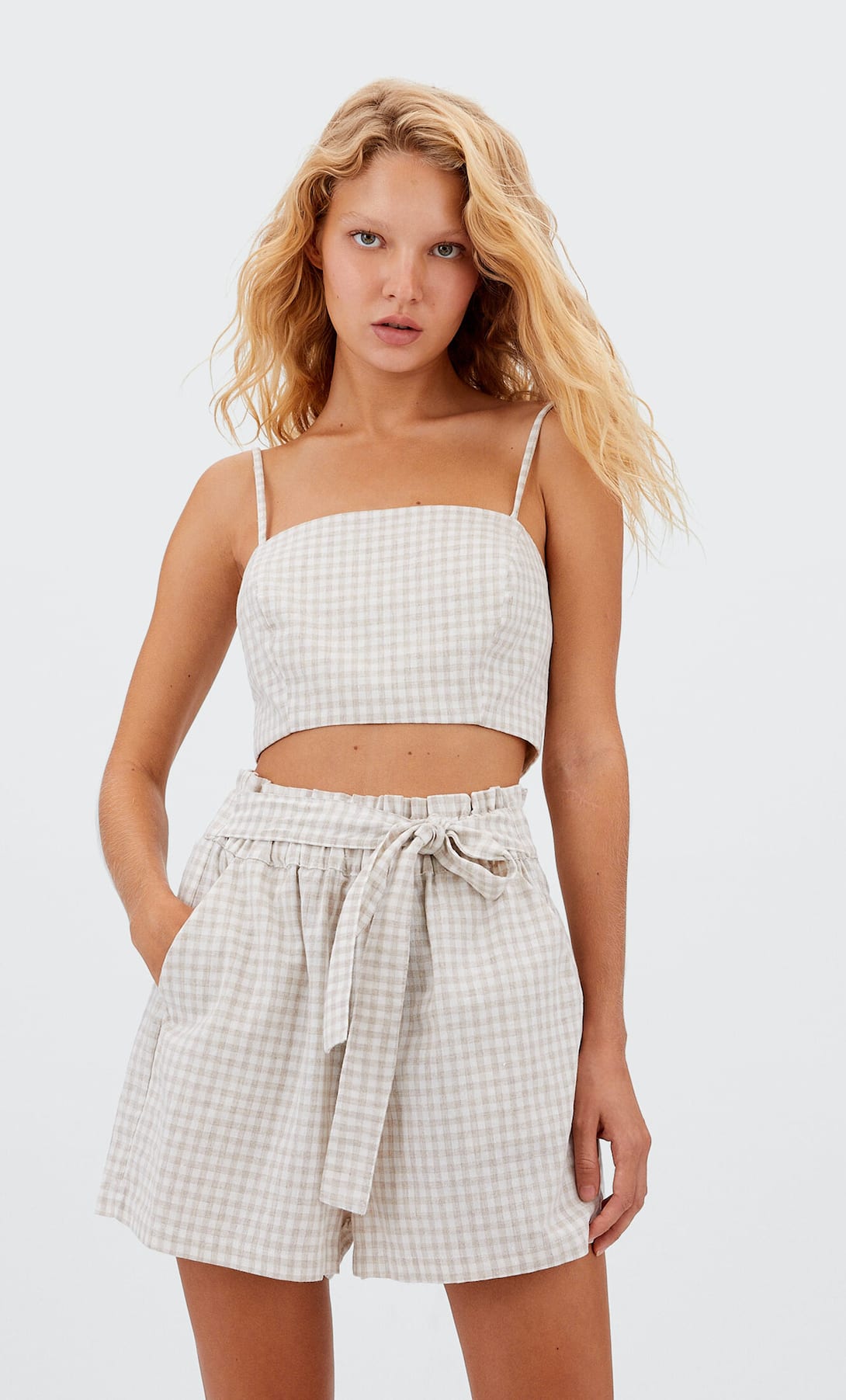 Comenzamos con este top de tirantes de estilo rústico y escote recto que tiene un estampado de vichy en color blanco y color piedra. Es un top sencillo que cuenta con tirante que se pueden regular y un fruncido en la parte de a espalda. Está disponible en tallas que van desde la XS a la XL. Está hecho en un: 41% algodón, 36% poliéster, 23% viscosa, con lo que resulta muy fresco y agradable de llevar. Puedes lavarlo a máquina a bajas temperaturas y también plancharlo. Si quieres también encontrarás unas bermudas a juego. Su precio es de 15,99 €. Sin duda será uno de los básicos de este verano.