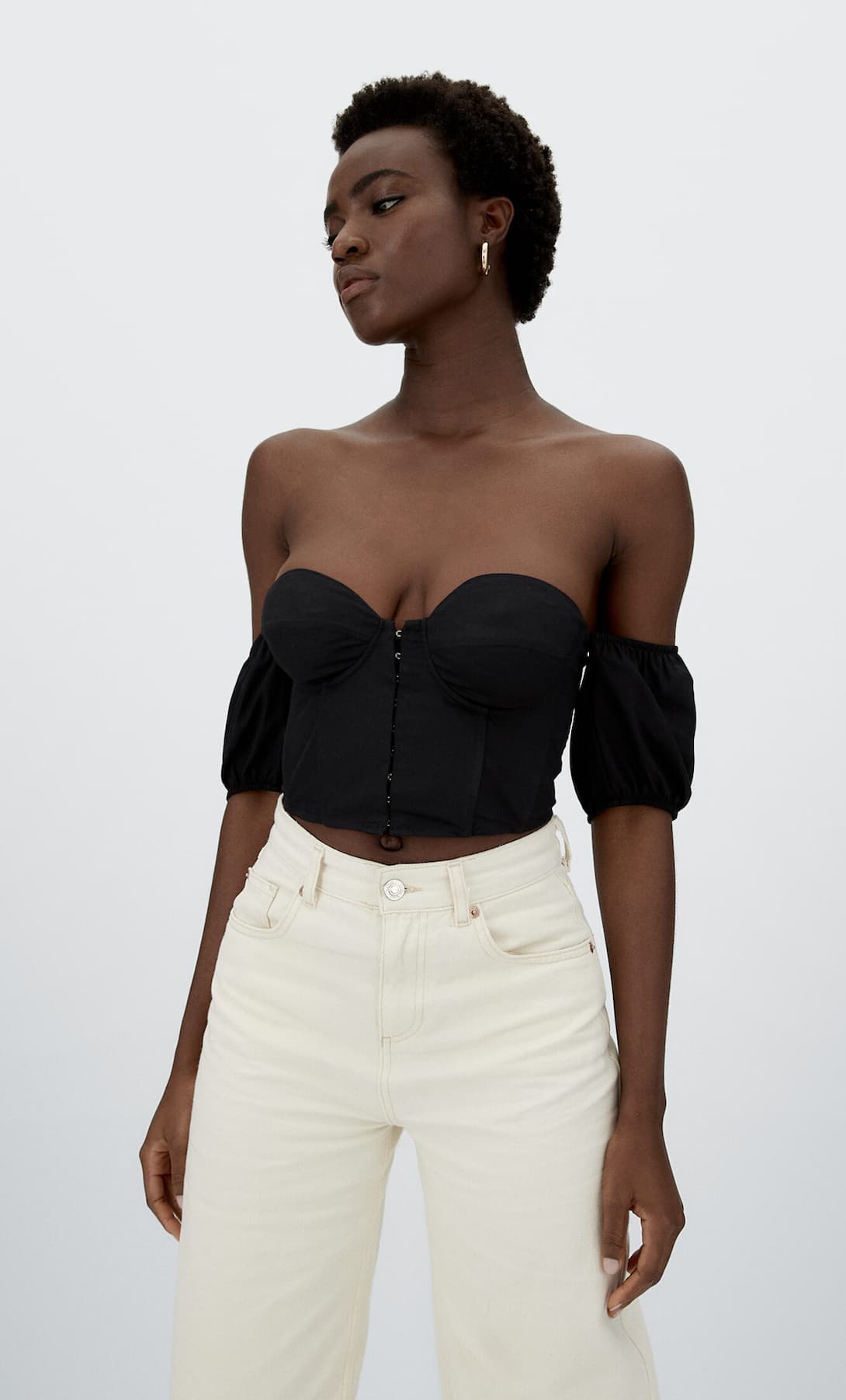 De estilo más elegante es este top que puedes comprar en su versión negra o blanca. Cuenta con un escote en forma de corazón que se combina de modo muy original con mangas cortas abullonadas. Además tiene diferentes detalles en las copas y varillas que nos hacen recordar un efecto corsé. Lo encuentras en tallas que van de la XS a la XL. Puedes combinarlo con bermudas o con pantalones en looks casual y desenfadados. Está hecho de un 96% algodón, un 3% elastodieno y un 1% poliéster. Por solo 19,99 euros conseguirás tu imagen más fashion este verano.