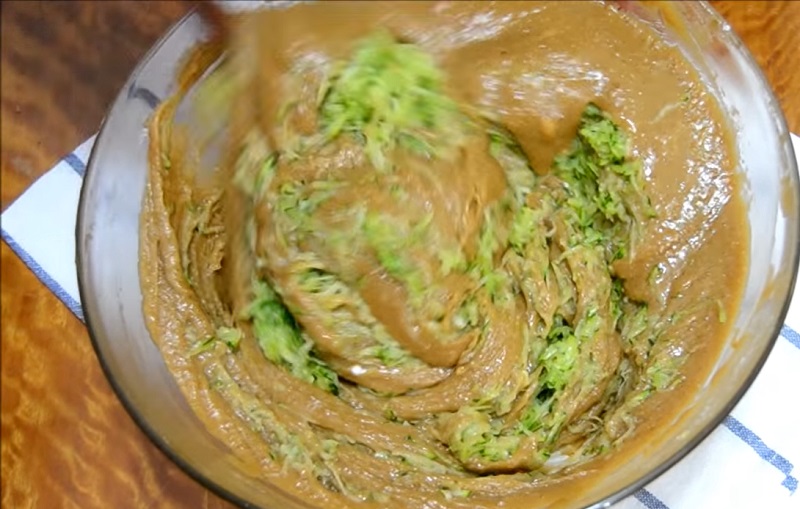 Una vez que tengas la masa bien mezclada, agrégale los trozos de calabacín escurridos. Con la ayuda de una lengua de silicona o una cuchara de madera, vete integrándolos con movimientos envolventes. De esta manera, repartirán por todo el conjunto. Pon el horno a precalentar y prepara el molde en el que vas a verter la mezcla. Échale unas gotas de aceite con un pincel para que no se quede pegado al fondo y a los lados.