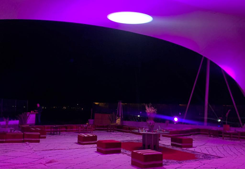 Unos focos en tonos morados iluminaban el cielo estrellado del desierto. Provenían de la terraza del hotel Dakhla Club, un enclave privilegiado con vistas a una laguna cristalina ideal para hacer kitesurf. Nada se veía debido a la noche pero se podría sentir la brisa del mar y la arena del desierto bajo los pies. Los invitados llegaron hasta la terraza del hotel que yacía decorada por alfombras blancas bordadas y velas bajo una carpa blanca. La impresionante voz de Nissrin Bouguida, una joven cantante marroquí, amenizaba la velada con canciones españolas en árabe y francés para hacer así sentir en casa a miles de kilómetros a los empresarios españoles que durante estos días están conociendo la ciudad.