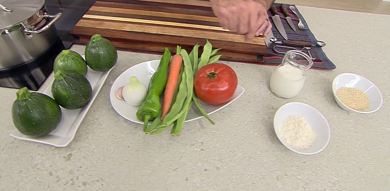 Para realizar este plato, Arguiñano prefiere usar calabacines redondos, ya que es más sencillo calcular la ración. Utilizaríamos uno por comensal, pero también puedes emplear los alargados. Otros ingredientes necesarios son judías verdes, una cebolla, un pimiento verde, una zanahoria, un tomate, un diente de ajo, 100 mililitros de leche, 15 gramos de harina, semillas de sésamo sin tostar, aceite de oliva virgen extra y sal.