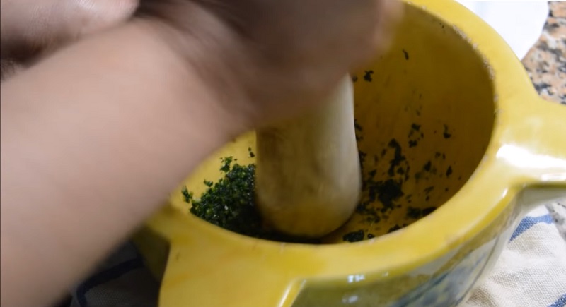 En primer lugar, debes preparar el majado. Para ello, machaca unas hojas de perejil en el mortero. Después, échale un par de dientes de ajo y tritúralos. Por último, vierte un chorro de aceite de oliva virgen extra para que sea más sencillo untarlo. Aunque vayamos a hacer la sepia guisada, antes hay que cocinarla a la plancha. Por lo que pon a calentar este aparato o coloca una sartén en el fuego...