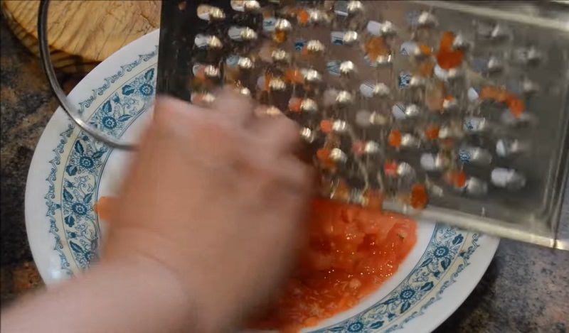 En lo que la cebolla se va pochando en el fuego, puedes ir rallando los tomates. Para que sea más sencillo escoge los más maduros que tengas por casa. Con la ayuda de un rallador, sácales todo su jugo. Con cuatro o cinco de tamaño mediano será más que suficiente. Añádelo al fuego cuando la cebolla esté dorada. El sofrito de la sepia guisada va cogiendo forma...