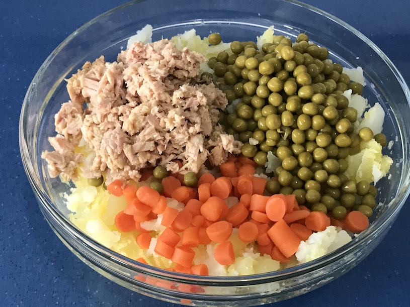 - Añade el huevo y las aceitunas picadas, también los pimientos asados y el atún. ¿Cuánto atún? El que vamos a decirte a continuación.