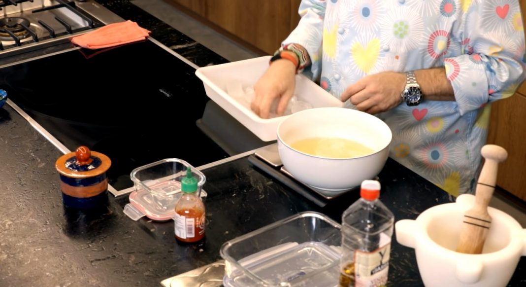Deja los boquerones en un recipiente una vez que los tengas limpios. Mientras tanto, vamos a preparar el marinado. Chicote pone en un bol medio litro de vinagre de vino blanco y le añade otro medio litro de agua en forma de hielo. Para no equivocarse en las cantidades, el cocinero lo pesa en una balanza. A esto le añade 100 mililitros de vinagre de Jerez y 70 gramos de sal.