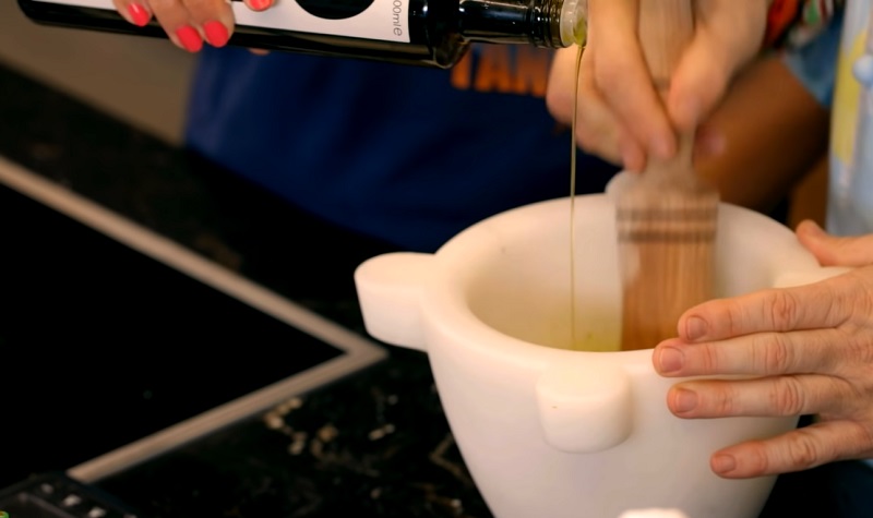 Para aliñar los boquerones, machaca un diente de ajo junto a un poco de perejil con el mortero. El secreto de Chicote es añadirle un poco de siracha, es decir, una salsa china picante que le da un toque de sabor muy potente. Después, le echa un buen chorro de aceite de oliva virgen extra. Como ves, el aliño de los pescados no puede ser más sencillo.
