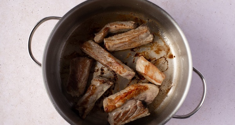 4Antes de las lentejas, dora las costillas en una olla a calentar con aceite de oliva