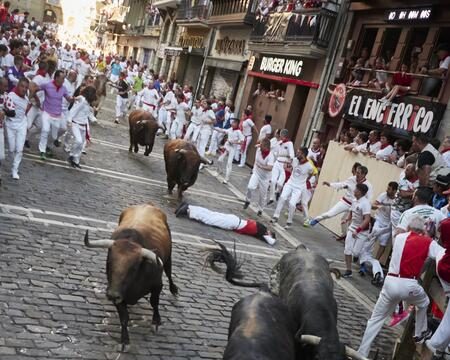En el tramo del Ayuntamiento, dos toros han entrado prácticamente juntos a gran velocidad, siempre buscando a los mozos, y ya en la curva de Estafeta varios de los 'cebada' han caído al chocar contra el vallado, pero se han levantado rápidamente y han continuado la carrera por esta calle a buen ritmo.