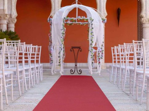El rojo, símbolo de amor, pasión y energía, es el tono de rigor en las moquetas especialmente elaboradas para las bodas. Con dimensiones de 1 y 2 metros de ancho por 30 metros de largo, la compañía atiende los requerimientos de las parejas que cada día se acercan en mayor cantidad a comprarlas.