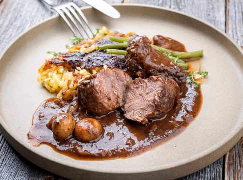 Cuando la carne ha quedado al punto, se sirve en un plato llano cubierto con salsa y con vegetales de acompañante. La experiencia se complementa con una copa de vino, obteniendo como resultado una experiencia gastronómica deliciosa e inolvidable.