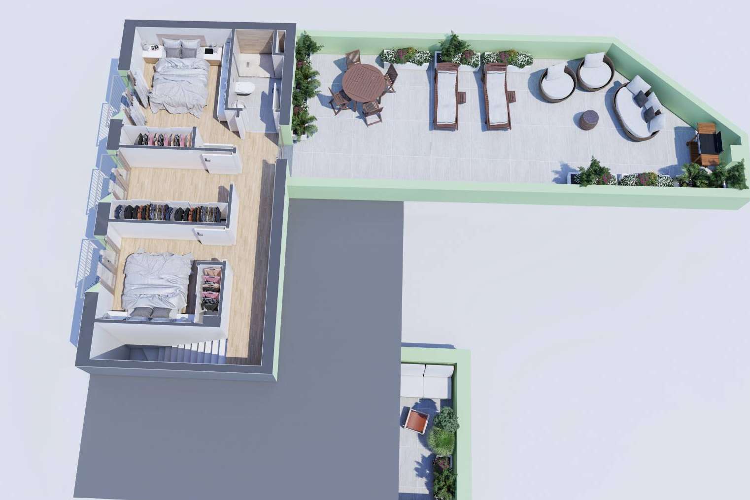 Se trata de una planta baja y 3 dúplex con amplias terrazas de entre 20 y 50 m², techos altos que consiguen una gran sensación de amplitud, escaleras sin contrahuella y ventanales que inundan de luz el interior. Cada una de las viviendas tiene su entrada independiente, lo que aporta un encanto añadido a los futuros habitantes de la promoción y ahorra el pago de la comunidad. La carpintería exterior es sumamente aislante tanto térmica como acústicamente y la climatización por conductos es a través de la aerotermia.