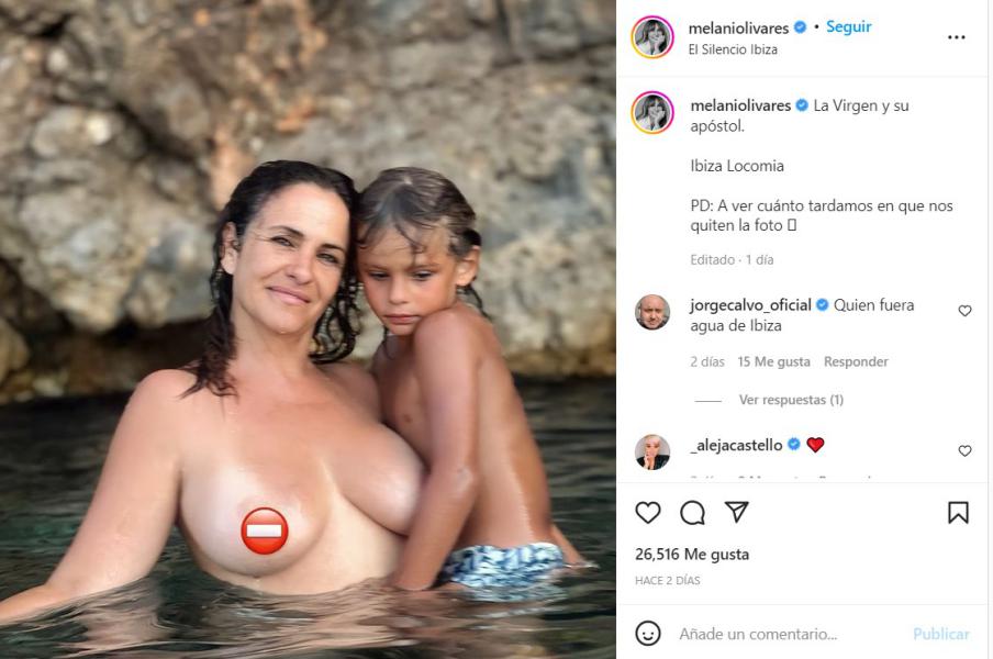 Melani Olivares se ha animado al topples en sus vacaciones en Ibiza. Para evitar que la publicación sea censurada ha recurrido al truco del emoji en el pezón. A lo que ella, conociendo ya las reglas de Instagram, ha añadido en el copy: "La Virgen y su apóstol. Ibiza Locomia. PD: A ver cuánto tardamos en que nos quiten la foto". Esta acción bien aplaudida, por ir en contra de la censura en Instragram. Sus seguidores mostraron su alegría por la imagen, y también expresaban su disconformidad en cuanto a la censura de la red social.