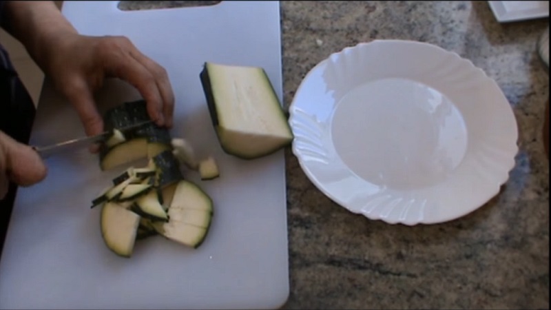 Seguimos con el calabacín. No es necesario que peles el vegetal, ya que le da una nota de color a la tortilla. Trocéalos en cachos finos para que se haga de una forma más sencilla. Una vez que ya están todos los ingredientes preparados, pon una sartén en el fuego y vierte un generoso chorro de aceite de oliva virgen extra.