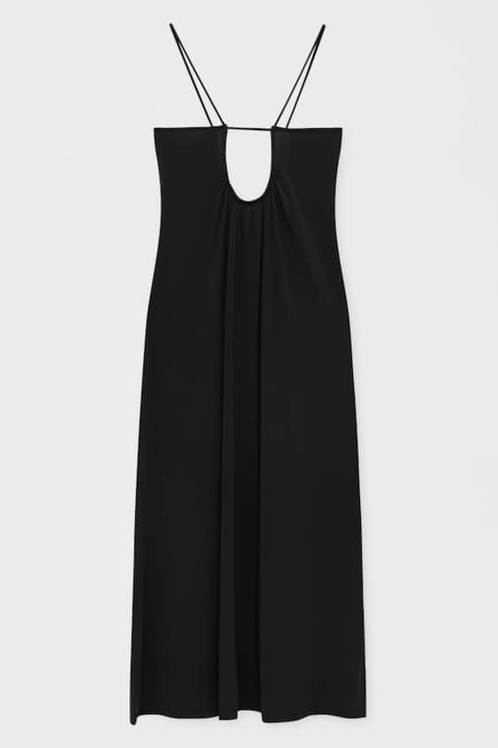 Los diseños cut out, es decir, con aberturas estratégicas, están muy de moda, y podemos verlo en todo tipo de prendas. Un buen ejemplo es este vestido de Pull&Bear de corte midi y estilo informal, con tirantes muy finos en diagonal y un llamativo escote cut out con forma ovalada. Lleva detalles de fruncidos en el pecho y la cintura. Es de color negro y es un vestido muy original con el que acertarás siempre. Está confeccionado en poliéster y elastano, y se ajusta suavemente al cuerpo. Lo puedes conseguir por 22,99€.