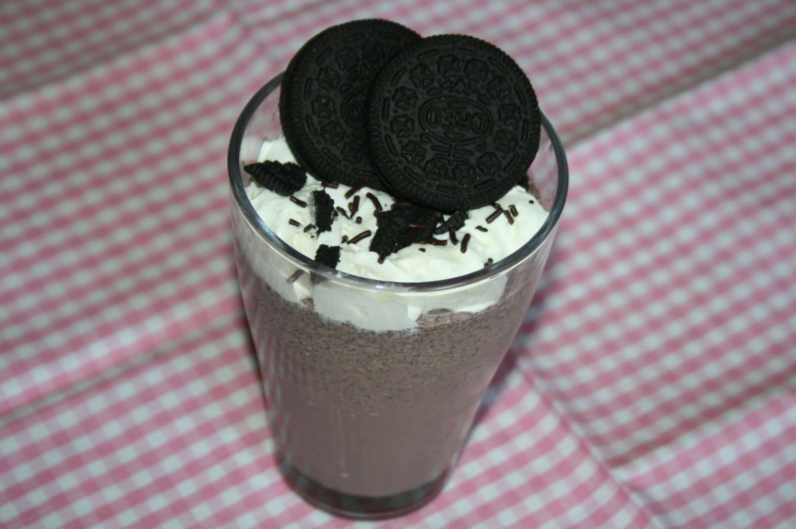 Una vez que tengas listo el batido de Oreo, viértelo en vasos de cristal y decora con la nata montada que tienes en la nevera. Forma una bonita decoración y para rematar, pon algunas galletas Oreo mini encima.