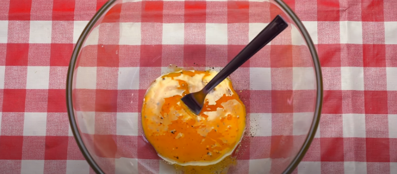 Toma un tenedor y mezcla muy bien las yemas hasta dejarlas bien integradas; y una vez que las yemas estén ligadas, añade sal y también una buena cantidad de pimienta negra recién molida.